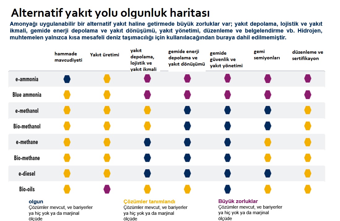 Amonyağı uygulanabilir alternatif yakıt haline getirmede büyük zorluklar var. Hidrojen yalnızca kısa mesafeli deniz taşımacılığı için kullanılacağından buraya dahil edilmemiştir.