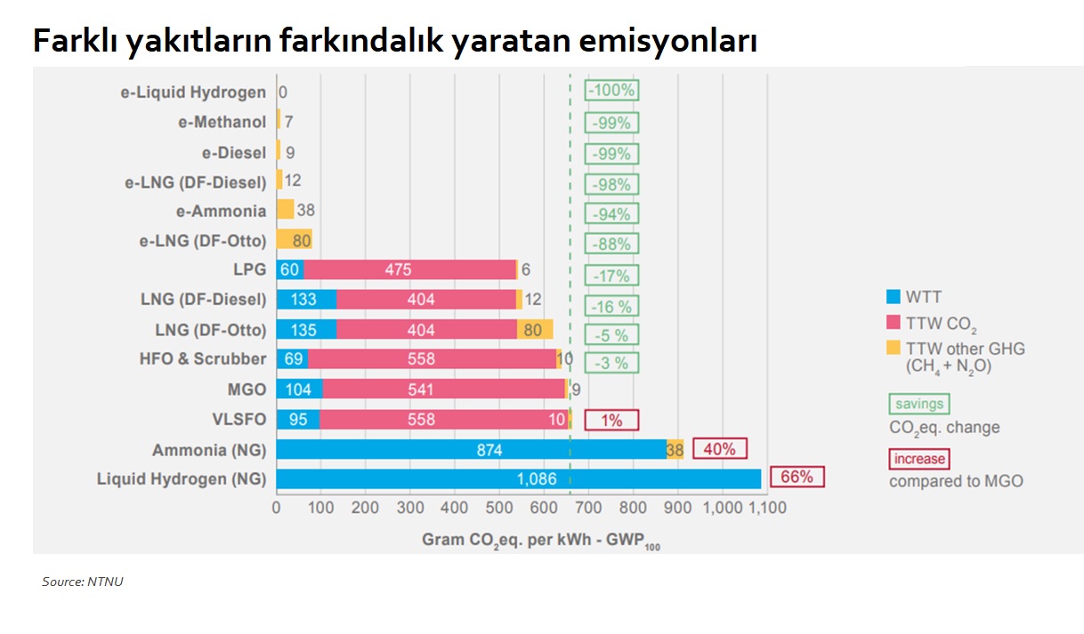 Tablo; Marine Gas Oil’in (motorin) karbon emisyonu esas alınarak hazırlanmış (654 gram CO2 equivalent per kWh) olup tabloda tüm e-yakıtların doğa dostu ve minimum karbondioksit emisyonuna sahip olduğu görülecektir.