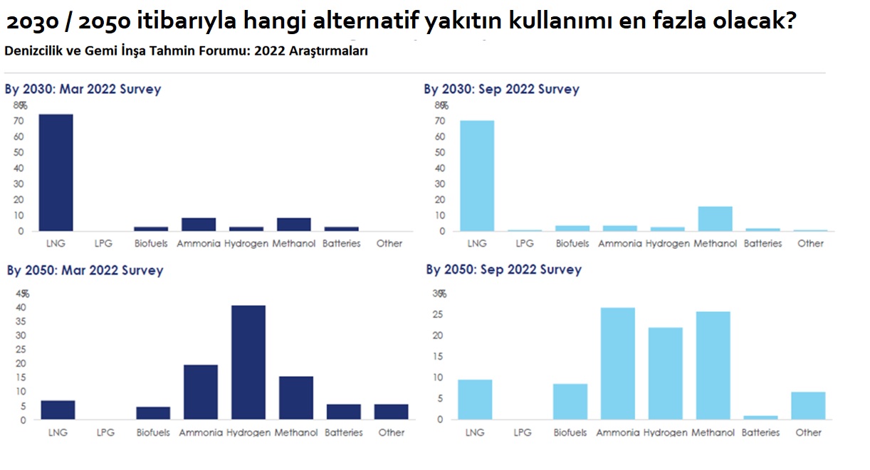 2022 yılı Gemicilik ve Gemi İnşa Tahmin Forumu araştırmaları incelendiğinde armatörlerin ve yeni gemi yatırımcılarının özellikle 2030/2050 tahminleri, 6 aylık sürede bile kafalarının ne kadar karışık olduğu ekli tabloda görülecektir.