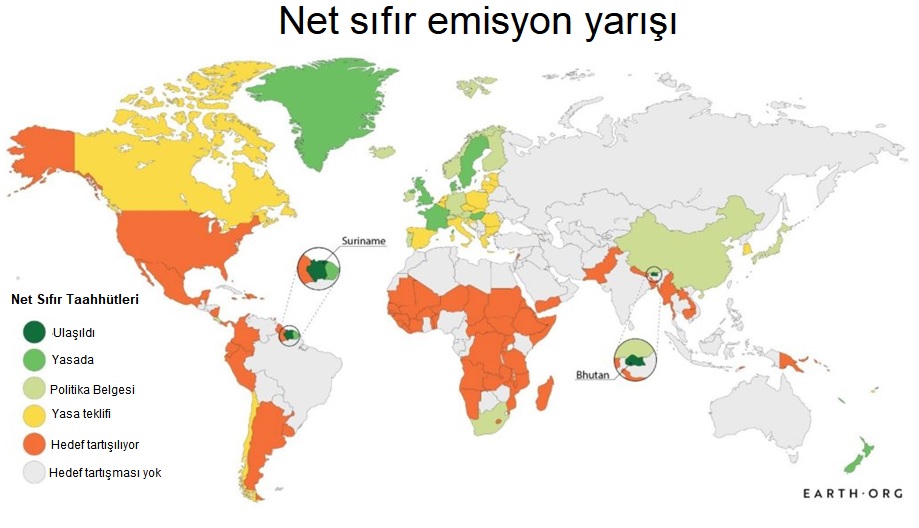 Ülkelerin çoğu 2050 itibarıyla karbon nötr olma sözü verdi. Çin ve Hindistan gibi büyük ülkeler sırasıyla 2060 ve 2070 itibarıyla net sıfır olma sözü verdiler.