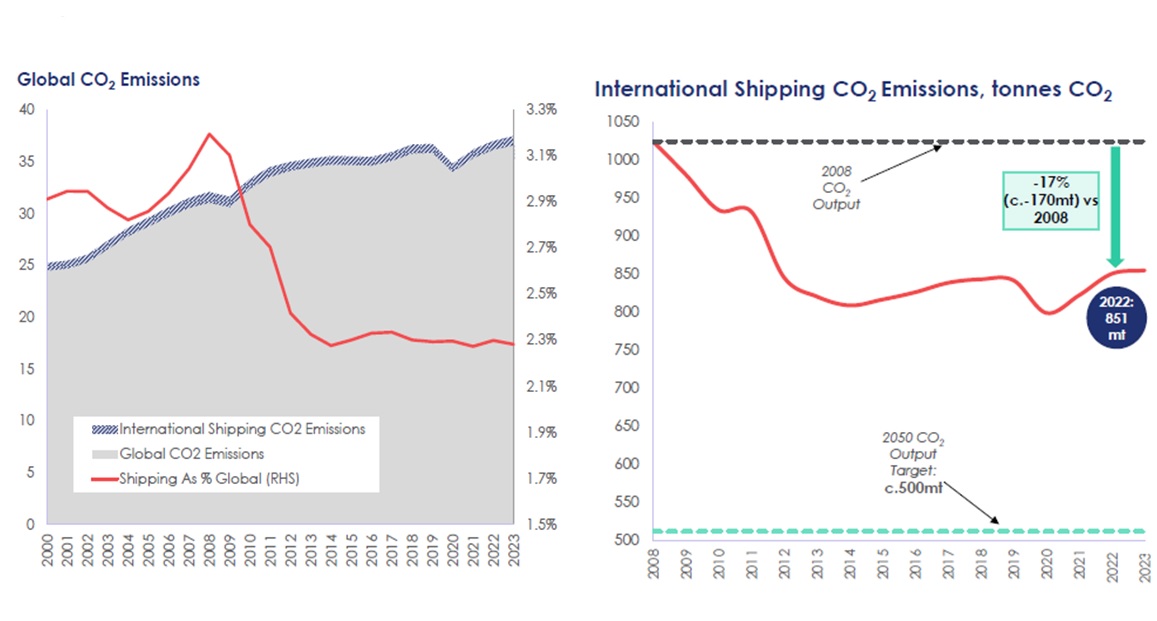 Ekte görülen tablo, denizcilerin global CO2 emisyonlarının düşürülmesinde sağladığı başarının tablosudur. Neden mi? 2008 yılında 8 milyar ton denizyolu ile taşıma yapılırken üretilen 1.020 milyar ton CO2 emisyonuna karşın 2022 yılında denizyolu ile taşıma 12 milyar tona çıkmış (yaklaşık yüzde 50 fazla) buna karşın CO2 emisyonları 851 milyon tona, başka bir deyişle 2008 yılına kıyasla yüzde 17 (170 milyon ton) düşürülmüştür. Bunun ana nedeni gemi süratlerinin bu dönemde yaklaşık yüzde 15 azaltılmasıdır.