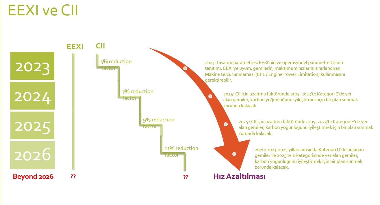 Bu yıl EEXI ve CII uygulamaya başlanması, gemilerin tasarım ve operasyonel karbon yoğunluğunun değerlendirilmesini gerektirecektir. Uyumluluk gereklilikleri, yıllar içinde artan azaltma faktörleriyle beraber bağlayıcıdır.