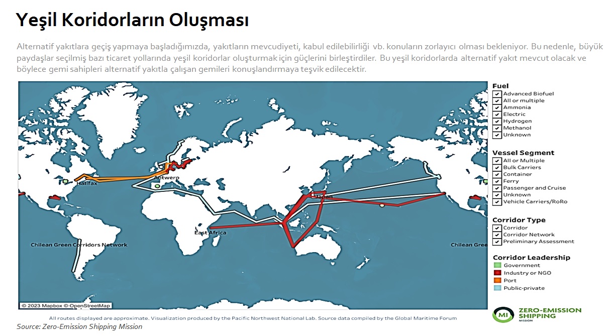 Alternatif yakıtlara geçiş yapmaya başladığımızda, yakıtların mevcudiyeti, kabul edilebilirliği ve benzeri konularda zorlayıcı olması bekleniyor. Bu nedenle, büyük paydaşlar seçilmiş bazı ticaret yollarında yeşil koridorlar oluşturmak için güçlerini birleştirdiler. Bu yeşil koridorlarda alternatif yakıt mevcut olacak ve böylece gemi sahipleri alternatif yakıtla çalışan gemileri konuşlandırmaya teşvik edilecektir.
