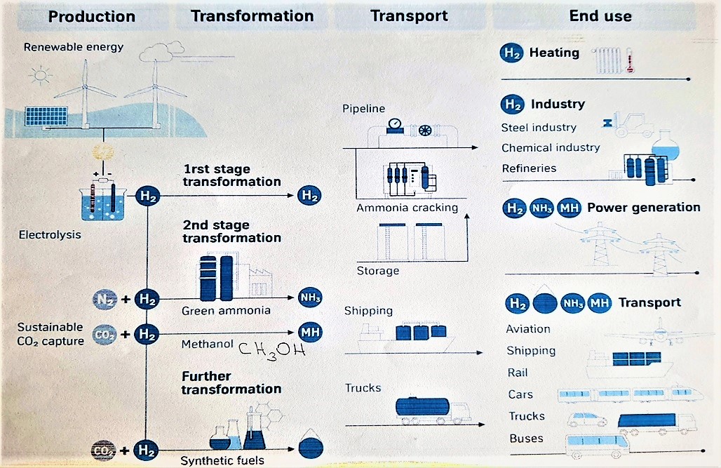 Yeşil yakıtların (e-hidrojen, e-metanol, e-amonyak) nasıl elde edildiğini ekteki tabloda görmekteyiz. Bu tablo bize şunu anlatmaktadır; yenilenebilir kaynaklardan (güneş ya da rüzgâr) önce elektroliz yoluyla yeşil hidrojen üretilir. Yeşil Amonyak; üretilen yeşil hidrojenin nitrojen ile, Yeşil Metanol ise; üretilen yeşil hidrojenin sürdürülebilir yakalanmış CO2 ile dönüşümünden üretilir.