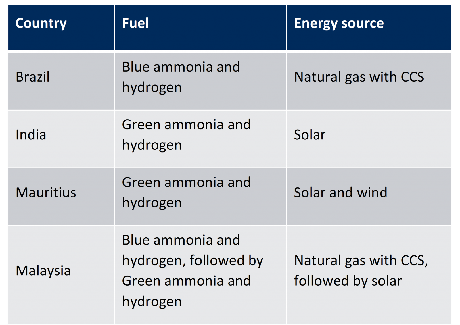 Some developing countries are also suitable for the zero-carbon manufacture of ammonia. These countries are characterized by their low-cost renewable energy sources combined with other advantages, such as a combination of gas reserves and access to low-cost CCS technology.