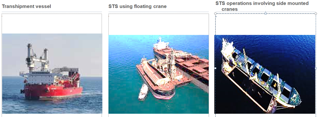 In dry bulk, STS is not feasible between a Cape or Panamax and Handymax vessel due to air draft issues. However, its possible by using transhipment vessels or floating cranes or using a vessel with side-mounted cranes, but will involve additional costs. It is also possible to discharge the cargo at berth and load it into another vessel at the berth, but the cost impact needs to be evaluated.
