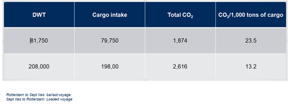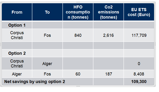 In option 1, the EU ETS compliance cost to transport the same amount of cargo between the same departure port and final destination port is reduced by 109,300 Euro. This comes to about 1 Euro per tonne.