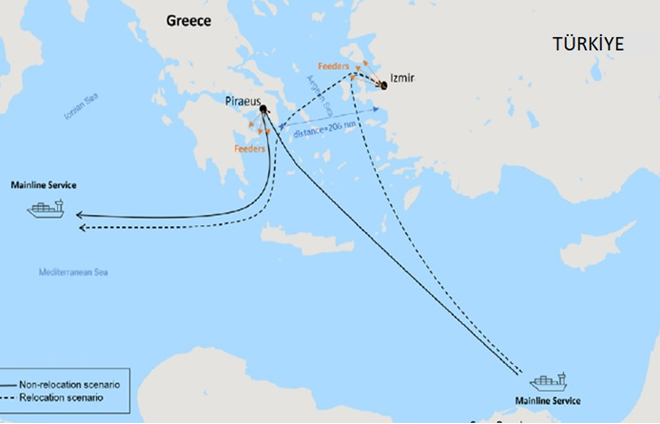 Any additional port cost and any additional bunker cost are taken into consideration. Calculations for the feeder services that would relocate to Izmir as a result of the mainline hub relocation is not considered.