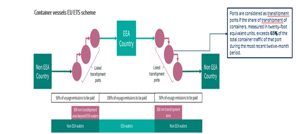 To avoid evasive behaviour, container ships stopping in transhipment ports outside the EU/EEA but less than 300 nm from an EU/EEA port, need to include 50% of the emissions for the voyage to that port as well, rather than only the short leg from the transhipment port. The EU will provide a list of transhipment ports.