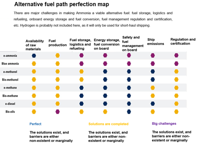 There are major challenges in making ammonia a viable alternative fuel. Hydrogen is not included here as it will only be used for short-distance shipping.
