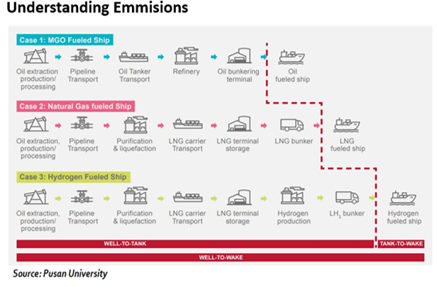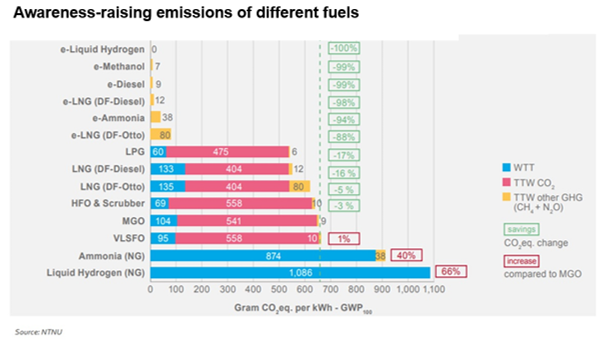 When production is made from natural gas, hydrogen emits 66 percent more carbon than Marine Gas Oil and 40 percent more carbon than Ammonia.