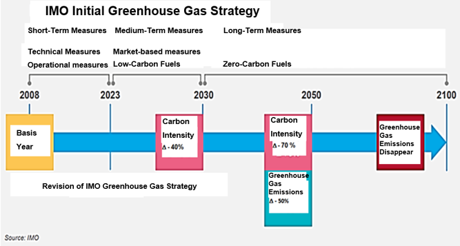 Based on 2008, the World Maritime Organization produced strategies (plans) for 2023, 2030, 2050, and 2100, as well as short, medium, and long-term route and carbon intensity targets.