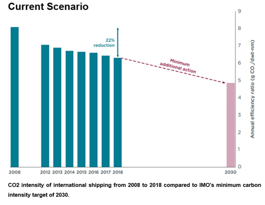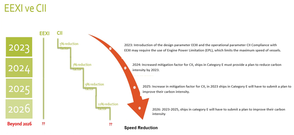 IMO's; In order to reach the target of limiting the CO2 emission to 5 grams in the transportation of 1 ton of cargo by 1 mile by 2030, the most appropriate method is to limit the machine power of the ships and accordingly to reduce their speed.